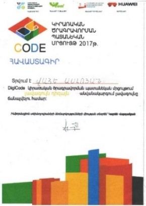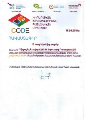 - DigiCode կիրառական ծրագրավորման պատանեկան մրցույթում «Լավագույն խաղ» անվանակարգում լավագույնը ճանաչվեցին՝ Միքայել Նավոյանը և Էդուարդ Ղազարյանը։